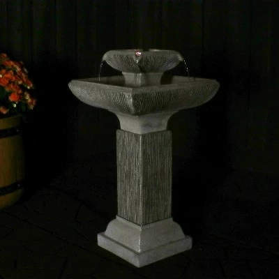 Create an all-encompassing charm by adding this elegant bird bath water fountain feature to the patio, deck, garden or yard. The 2-tier water fountain features a durable resin construction paired with the contemporary square design. Experience soothing relaxation by listening to the sound of the water smoothly flowing from the upper tier, down 4 spouts and into the lower basin of the fountain where it recirculates through the submersible electric pump. No plumbing is required, just plug it in to a standard outdoor electrical outlet when ready to operate. Images include product in nighttime environment.