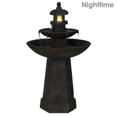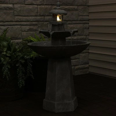 Make this beautiful Tiered Pagoda Outdoor Fountain with LED Lights the centerpiece of your garden or patio. Made of lightweight polyresin, this fountain has durable construction and has the appearance of natural stone for long-lasting elegance. You will love the soothing sounds produced by the water streaming from tier to tier. Inspired by Asian architecture, this fountain has a unique pagoda-like design that will add a touch of style to any space. The water will be recirculated through the fountain thanks to an electric submersible pump. No plumbing is required for installation. Images include product in nighttime environment.
