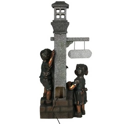 Add whimsy and charm to any patio or yard with this elegant fountain featuring playful children gathering around the water faucet to fill up their buckets after an afternoon full of sun. This outdoor garden fountain is sure to add a lighthearted, carefree feel to any outdoor space. There are two LED lights; one is electric and located in the bottom “basin” reflecting in the water and lighting up the decor piece at night. The other is a solar light located in the top gray “window”, charged by the solar panel located at the top of the fountain. Charges during the day via sunlight and the on/off switch located near the solar panel turns the light on and off easily. Once the fountain is in-place and filled, simply plug it into a standard electrical outlet. Images include product in nighttime environment.