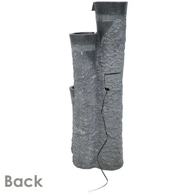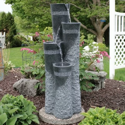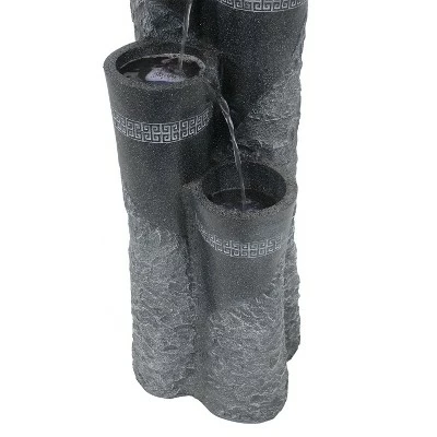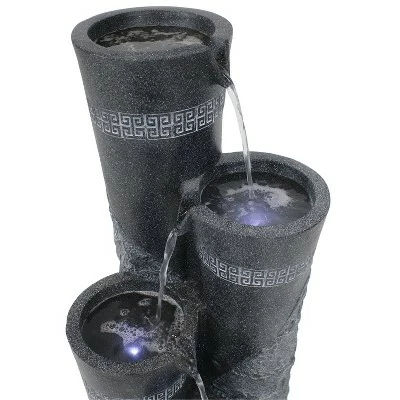 Add an accent to the front door or patio with this attractive outdoor fountain. Each tier features a Greek key design pattern at the top for a touch of embellishment. This fountain also features bright white LED lights in the lower three tiers, so this fountain can be enjoyed at night. An included electric submersible pump recirculates the water, allowing for a continuous flow of water through the fountain. Plus, this fountain does not require any plumbing for installation. Images include product in nighttime environment.