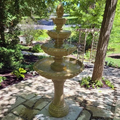 This large outdoor electric 4-tiered water fountain will add instant charm and soothing energy to any outdoor patio, landscape or backyard. Featuring a durable resin construction with concrete in the base to ensure stability, and 2 LED finger lights, this fountain is designed to last. The decorative eggshell edge detailing and pineapple topper provide a contemporary touch to a traditional style. Water flows from the top tier down to the largest bottom tier, with flowing water sounds that are sure to be instantly soothing. No plumbing is required; simply plug the fountain into a standard outdoor electrical outlet once it has been assembled and filled with water. Images include product in nighttime environment.