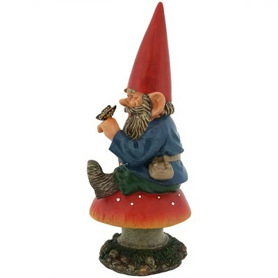 This cute garden gnome carries a butterfly while sitting atop an orange mushroom and will accent any landscape and lawn perfectly. He is a very playful, humorous and outgoing gnome who loves to protect and save all living beings. Adam the gnome will be a happy addition to any outdoor space with his relaxed stance, cheerful face and beautiful butterfly that are sure to make everyone smile. He wears a red conical hat, blue long sleeved shirt and light brown belt with green pants and brown shoes. The expertly painted piece also features a rocky plot with green grass.