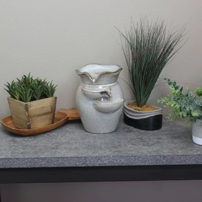 Make any home or office more tranquil and serene with the Cascading Side Tiers Ceramic Tabletop Water Fountain from Sunnydaze Decor. Water gently flows from the top tier with the gently curved edges down into the side tiers below. This small water feature will spruce up a desktop in any office cubicle or the counter in the kitchen. Everything needed to put this decorative accent is in the box, including 1 indoor tabletop fountain and 1 electric submersible pump. No plumbing is required as the pump continuously recirculates water through the fountain.