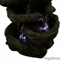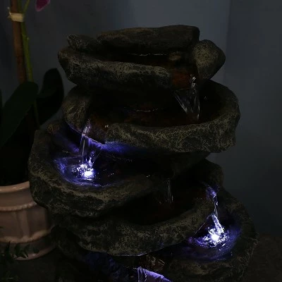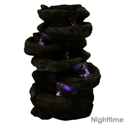This durable tiered lightweight fountain is designed to look like real stacked stones with water flowing over each of the 6 levels of rock pools. The soothing sounds it creates combined with the neutral grey, white and subtle red color scheme will have guests and loved ones relaxing in no time! The electric pump enables the gently flowing water to flow from the top tier all the way down to the bottom pool where it then recirculates back through the fountain. The fountain features small pebbles in each rock pool, padded feet to protect the table surface, natural detailing and LED lights on the 3rd, 5th and 6th levels. Images include product in nighttime environment.