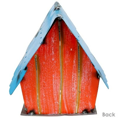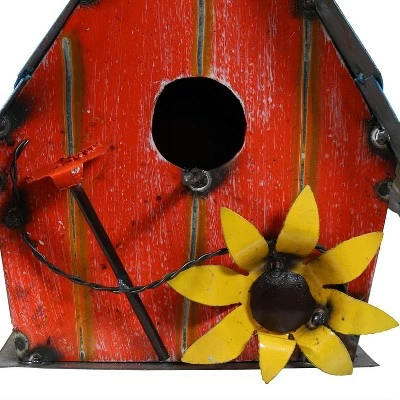 Hang this decorative birdhouse from a shepherd’s hook in your yard, set it on a table on your patio, or display it in your sunroom or home. The cheery sunflower and red color add a bright accent no matter where you hang it. This birdhouse is made from metal and is best used for decorative purposes only. A hanging chain at the peak of the house allows you to easily hang this metal birdhouse anywhere you’d like.