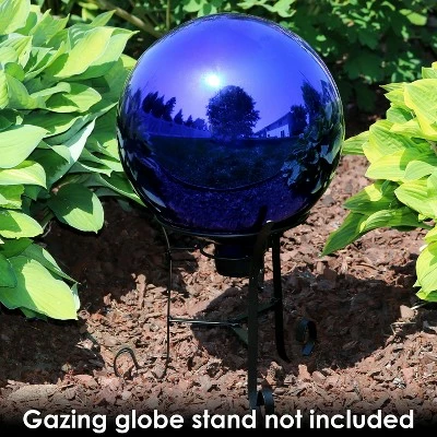Add this mirrored gazing ball globe to any garden or patio for a stunning outdoor accent. The blue reflective surface of this gazing globe is an attractive feature that will enhance many outdoor living spaces. This decorative ball looks great alone or paired with a stand of choice (please note, that a stand is not included with this item; must be purchased separately). The stemmed bottom has a rubber cap, making it easier to place the globe on a stand or holder. Always store gazing globe indoors before freezing weather occurs to better ensure its longevity.