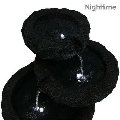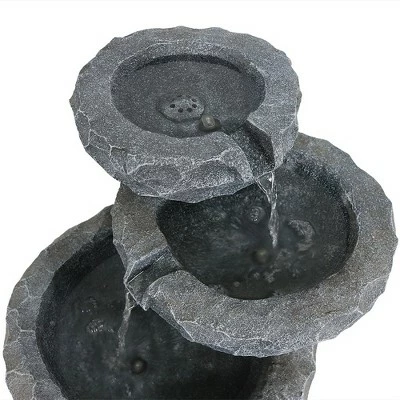 Add a nature-inspired touch to any garden, patio, porch, or backyard with this solar with battery backup water fountain. Simply connect the solar fountain pump to the tube in the fountain, connect the LED light cord and solar pump cord to the solar panel and place the solar panel in the sun. With solar-only mode, the pump will run using the direct sunlight over the solar panel. To use the battery mode, press the Battery On/Off button and the battery will now power the pump. On the battery mode, the fountain will run up to four hours on cloudy days or at night. The largest bottom level measures 15.5″ diameter x 8.5″ tall with a 4″ bowl depth, the middle level measures 12.5″ diameter x 5.5″ tall with a 3″ bowl depth, the top level measures 10.5″ diameter x 4.5″ tall with a 2.5″ bowl depth. Images include product in nighttime environment.
