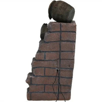 Add a rustic pastoral scene to any backyard garden or patio with this outdoor water feature. Made of polyresin, this fountain looks like crumbling bricks with water steadily streaming from each of the pots. The bottom basin features a bright LED light that illuminates the water, making it the perfect outdoor decor piece to enjoy on summer evenings. No need to worry about plumbing since this fountain has an included pump that recirculates water throughout the fountain. This fountain uses solar energy to power the pump and the LED light. This solar with battery backup fountain can run on solar and battery power; when fully charged the batteries will power the fountain for up to 4 hours. Images include product in nighttime environment.