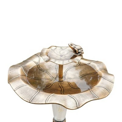 Create an outdoor bird sanctuary with the Teamson Home Outdoor 40″Tiered Lilypad and Frog Birdbath. This pedestal tiered birdbath creates a place for birds to gather while also adding a decorative accent to your backyard, lawn, or patio. The elegant lily pad and frog design in an antique gold finish adds visual interest to your outdoor space, while the integrated lantern allows you to put in your own LED lights (not included) to illuminate the bowls. This versatile birdbath can be filled with water or with birdseed to transform it into a birdfeeder. Made with durable and weather-resistant polyresin, this birdbath provides long-lasting outdoor use. This two-tier birdbath measures 19″ x 19″ x 40″ to accent any outdoor area.