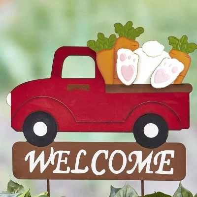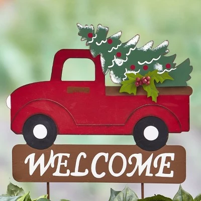 Roll with the seasons while staying holiday clique with this interchangeable welcome sign decoration in your front yard or garden area. A red truck with a retro appearance acts as the “Welcome” sign and the truck bed is where the seasonal plaque piece goes. When the time of year changes or a new holiday rolls around, switch out the load sign the truck is carrying in the bed. Because the truck also has an attached jute rope hanger, you can remove the stake piece and turn it into a door hanger or a wall decoration for inside the home. Set includes: American flags – Bunny and carrots – Christmas tree – Clovers – Flowers – Hearts – Pumpkins. Metal.15-1/2″W x 23″L, including the 8″ ground stake.
