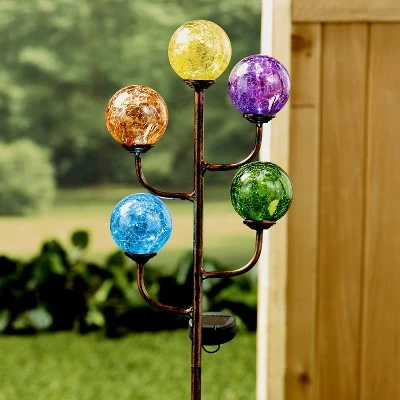 Create you own light display in your very own front yard with this lighted garden stake that has 5 different colored bulbs and is solar powered. Utilizing solar energy and a compact design, you can place this lighted yard ornament anywhere you’d like. There’s no batteries or cords to fumble with, so you can stake it and go on with the day. Place it in the garden for lighted accent that’s sure to catch the attention of those passing. Drop it in your flower beds for a multicolored lighted yard ornament. It features 5 glass balls of different colors–yellow, purple, red, green and blue. The solar panel charges during the day, and the LED lights inside the balls turn on automatically at night. Metal and glass. 9″W x 3-7/8″D x 33″H, including the 4-1/2″ ground stake.