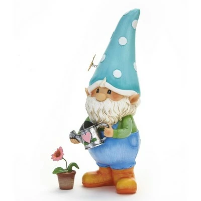 Add a whimsical touch to your outdoor space with this gnome garden figurine. Gnorm is wearing blue overalls and a matching blue hat with polka dots. He’s holding a watering can to water his potted plant. His bright blue colors adds a mythical accent to your home’s outdoor gardening elements. He is made of sturdy material, so he’ll stand up to the spring and summer weather. Bring him inside or store him away when the weather turns wet and cold. Cold cast ceramic and iron. 4″W x 4″D x 11″H
