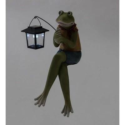Add a dash of whimsy and a welcoming nighttime glow when you display our Indoor/Outdoor Sitting Frog Sculpture with Solar Lantern. This charming fellow is sitting comfortably cross-legged and holding a small lantern to light the way. A solar panel in the top of the lantern powers its glow after dark without the need for batteries or electric cords. His colorful wardrobe is perfect for a day on the porch or beside the pond. Cast in weather-resistant resin and painted in bright hues.
