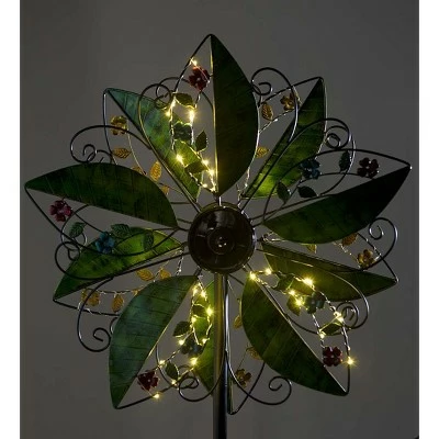 This colorful Solar Leaves Wind Spinner has it all. Five large metal leaves on each of two independently-turning rotors display colorful flowers, smaller leaves and twisting iron curlicues. The whole assembly also rotates freely on its pole so it will turn in the direction of the prevailing breeze for maximum spin. Our patented solar technology allows the integrated LED lights to put on a spectacular light show after dark..