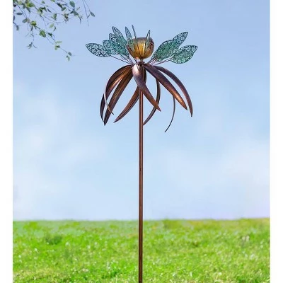 This Leaves and Swirls Metal Wind Spinner is a stunning piece of garden art that is sure to attract the attention of guests and passersby. Intricately laser-cut patina-like green leaves spin at the top while gracefully arced bronze-colored fronds spin independently below. At the center, a golden cup displays a leaf silhouette. Standing seven feet tall, this dynamic spinner would be at home in the most sophisticated sculpture garden. The combination of the swirls and leaves in motion almost resembles a winged fairy or ballerina. Sturdy metal stakes ensure secure installation in your garden.