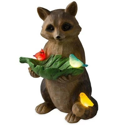 Our Raccoon Bird Feeder with Solar Lighted Birds will be a whimsical, yet functional, addition to your garden. This delightful decoration features a sweet raccoon holding up a jumbo leaf that you can fill with seed for your backyard birds. He’s already attracted a few, as a cardinal, bluebird and canary perch around him. All three birds glow after dark thanks to a discreet solar panel.