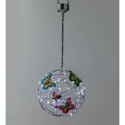 Our Solar Lighted Hanging Mesh Orb with Colorful Butterflies is a dazzling garden decoration you’re sure to love. This unique metal mesh globe is adorned with metal butterflies in a variety of sizes and color schemes. After dark, a string of tiny “rice lights” comes alive to light up the night thanks to the integrated solar panel. Hang it in a sunny spot to get maximum solar-powered glow! Hanging chain included.