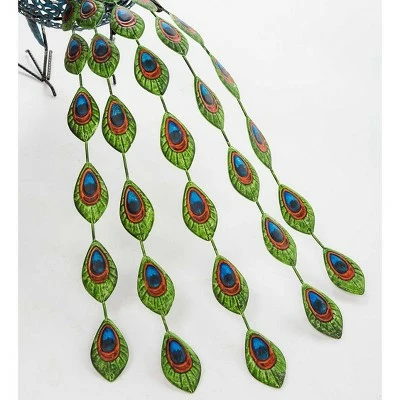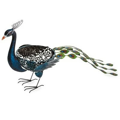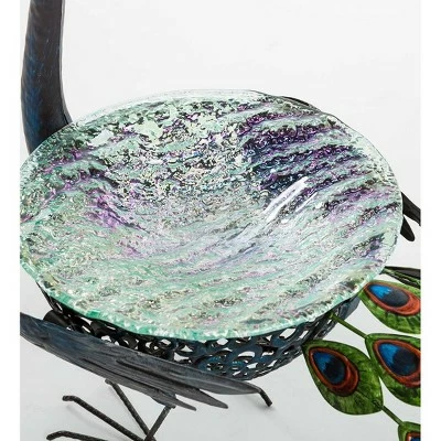 As much an art piece as a destination for backyard birds, our Vibrant Metal Peacock Birdbath with Glass Bowl will be the centerpiece of your outdoor decor. This stunning metal peacock comes complete with long, flowing tail feathers and a dazzling realistic paint scheme. The glass bowl is a striking aqua shade of blue and is adorned with three fish. It sits on her back for birds to bathe in and can be easily removed for cleaning.