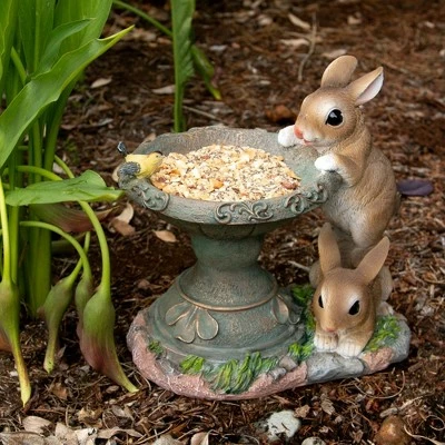 - This bird feeder is a sweet reminder of how playful bunnies can be! A brightly painted little bird is perched and ready to feed, while beckoning other birds to join him. Finely painted details make this bird feeder an excellent choice to add charm to your garden or patio.
