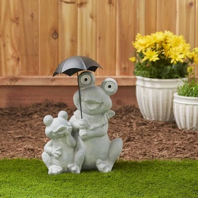 - Make your garden look like a whimsical place filled with magic and wonder with this adorable statue of charming frogs trying to stay dry under a very tiny umbrella. Made of polyresin, this statue looks like it is carved from stone and will be water and rust resistant.