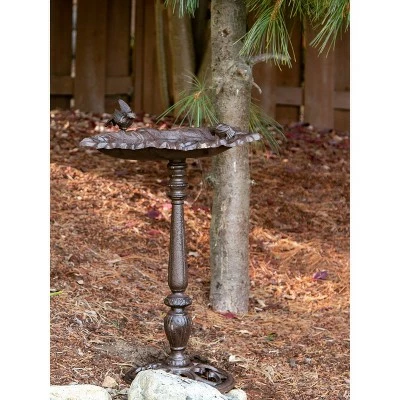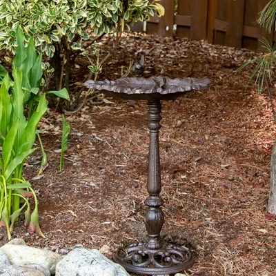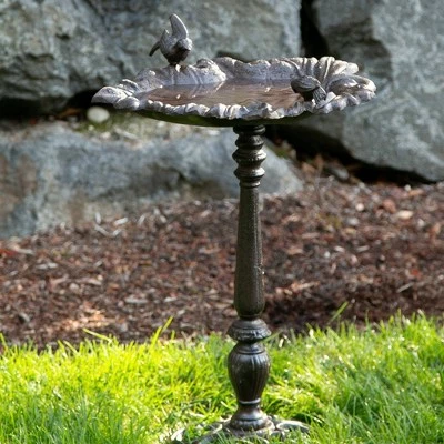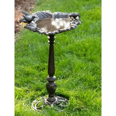 - Nostalgic, free-standing bird bath is fashioned from weathered finished metal for instant antique appeal. Charmingly crafted with an elegant scrolled base, ornamental leaf basin and ornamental birds for whimsical style.