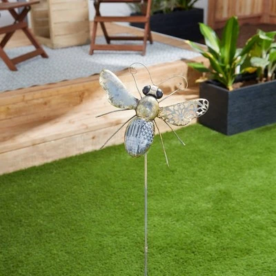 - Charming small bee garden stake is made of iron and measures 10.75×2.75×37 inches.