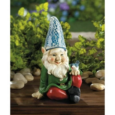 - You’d be happy, too, if a friendly little bluebird was perched on your knee! This charming garden gnome statue features a tall blue hat that lights up at night after soaking up the sun all day long.