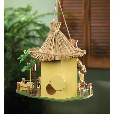 - It will always be happy hour in your backyard when you hang this charming birdhouse in your favorite tree. A thatched roof tops this tropical getaway, complete with barstools, drink special signs, and a little palm tree.